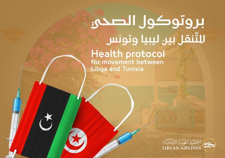 نود أن ننوه بأنه البروتوكول الصحي للتّنقل بين ليبيا وجمهورية تونس الشقيقة فقد قررت السلطات التونسية إعتباراً من من يوم الغد الإربعاء 27 أكتوبر2021م عن دخول القادمين من ليبيا ضرورة خضوعهم لفحصRT- PCR،سلبية مرفق برمز QR CODE وأن لا يتجاوز 72 ساعة شرط إبرازهم شهادة تطعيمهم الكامل ضد فيروس كورونا،